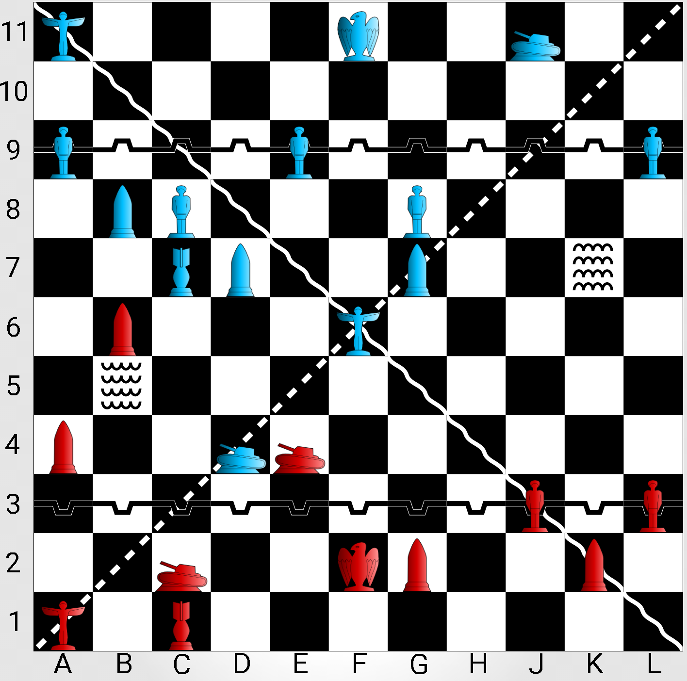 The game is played on an 11x11 grid which has two diagonally lines crossing it. The line from A1 to J11 is the mainroad which allows for faster movement. The line crossing from A11 to J1 is the river which blocks most movement. Each party has its own mainline which runs horizontally along the rows 3 and 9. They limit the movement of their headquarters (they can't enter the rows 4-8) and are important for one of the winning conditions (see below). There are two sea tiles at B5 and K7 which can't be entered by any unit.