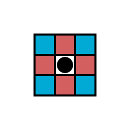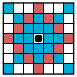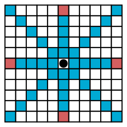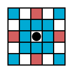 | The pieces can move to the red and blue tiles and capture/threaten enemy pieces that are on the red tiles. | |||||